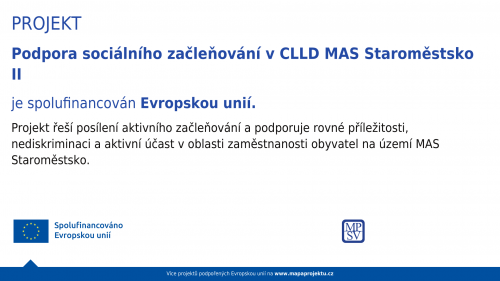 Projekt řeší posílení aktivního začleňování a podporuje rovné příležitosti, nediskriminaci a aktivní účast v oblasti zaměstnanosti obyvatel na území MAS Staroměstsko.